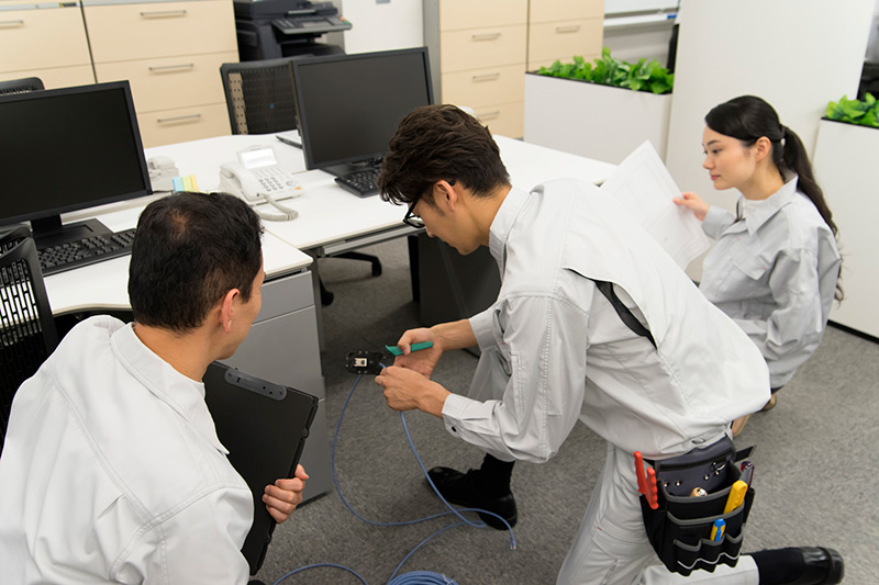 ネットワーク機器の設置・設定や通信ケーブルの配線をし、オフィスやご自宅にインターネット回線を引き込む工事を行います。終端装置の設定やLANケーブル配置、アンテナ工事、無線LAN(Wi-Fi)設置など、快適なネットワーク環境をお客様の元へお届けします。